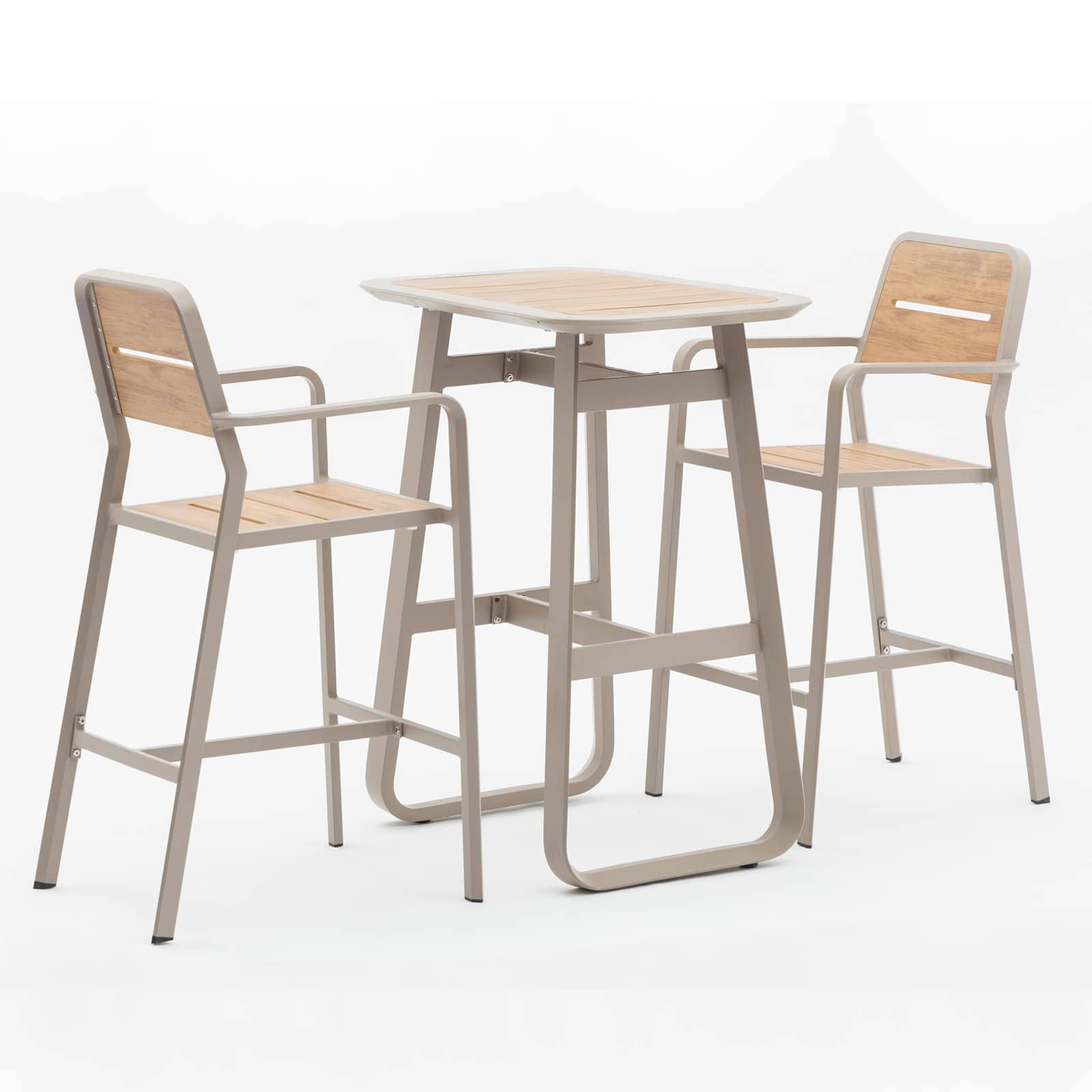 - Designed with style and durability in mind, the 3-piece bar table set includes two chairs and a table.