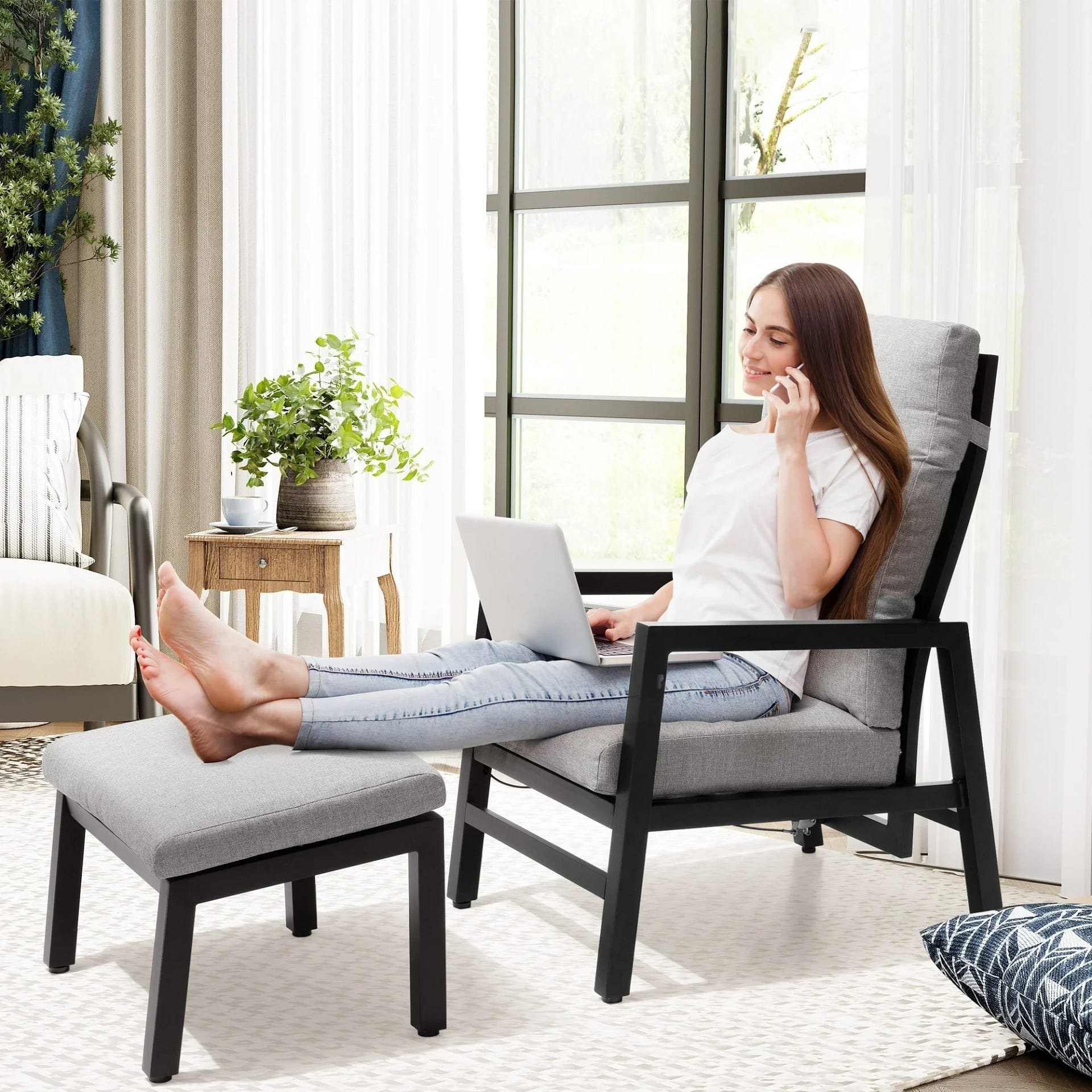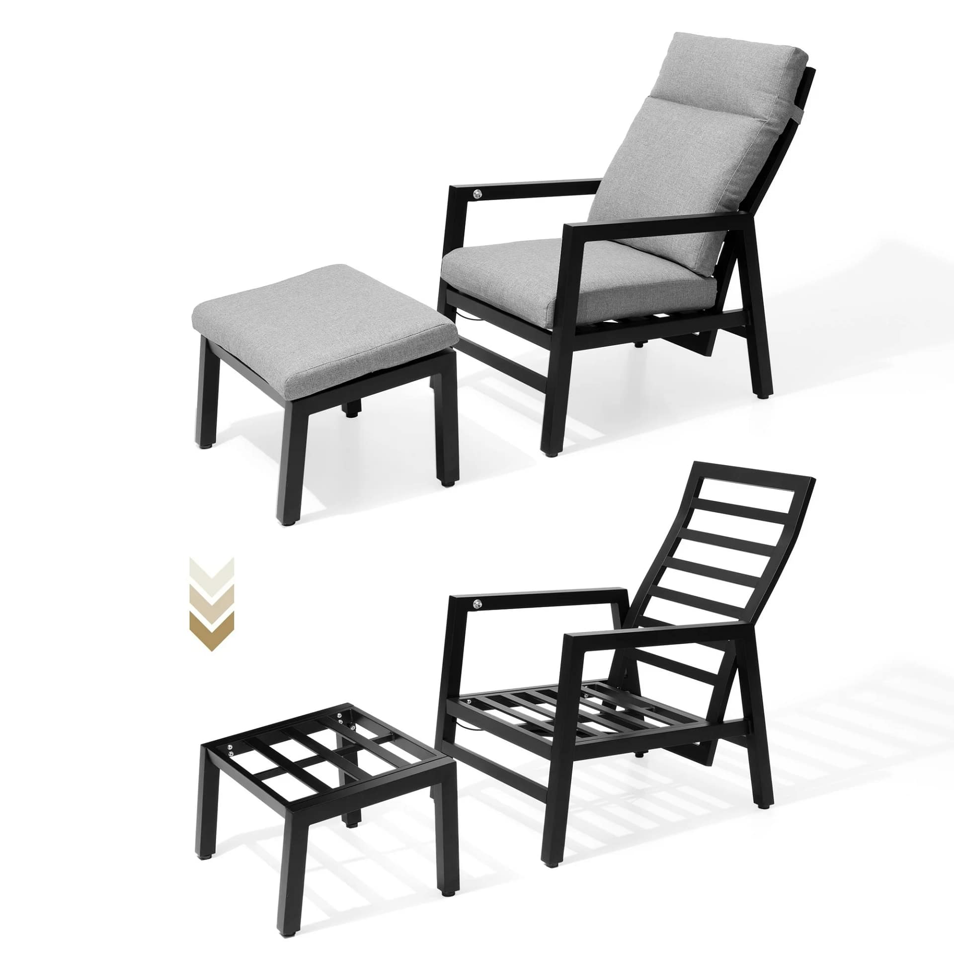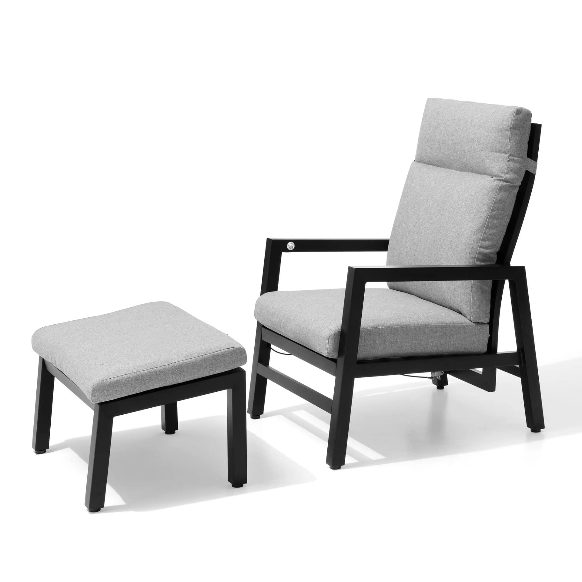 Discover the perfect blend of style and function with our modern indoor/outdoor recliner. This chair includes a matching footstool, an adjustable backrest, and solid armrests for superior comfort. Constructed with a robust aluminum frame and heavy-duty waterproof fabric, it offers exceptional heavy support and is built to last in any environment. Upgrade your relaxation with this contemporary, supportive design.