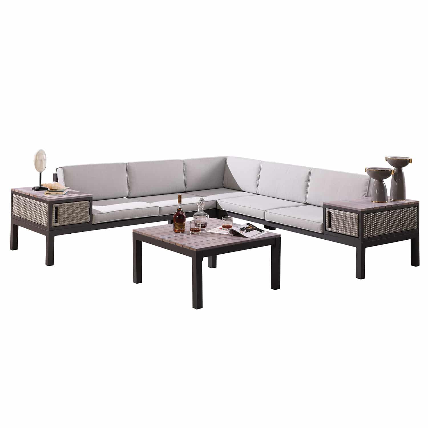 Aluminum, fabric, foam, PE wicker, beech solid wood